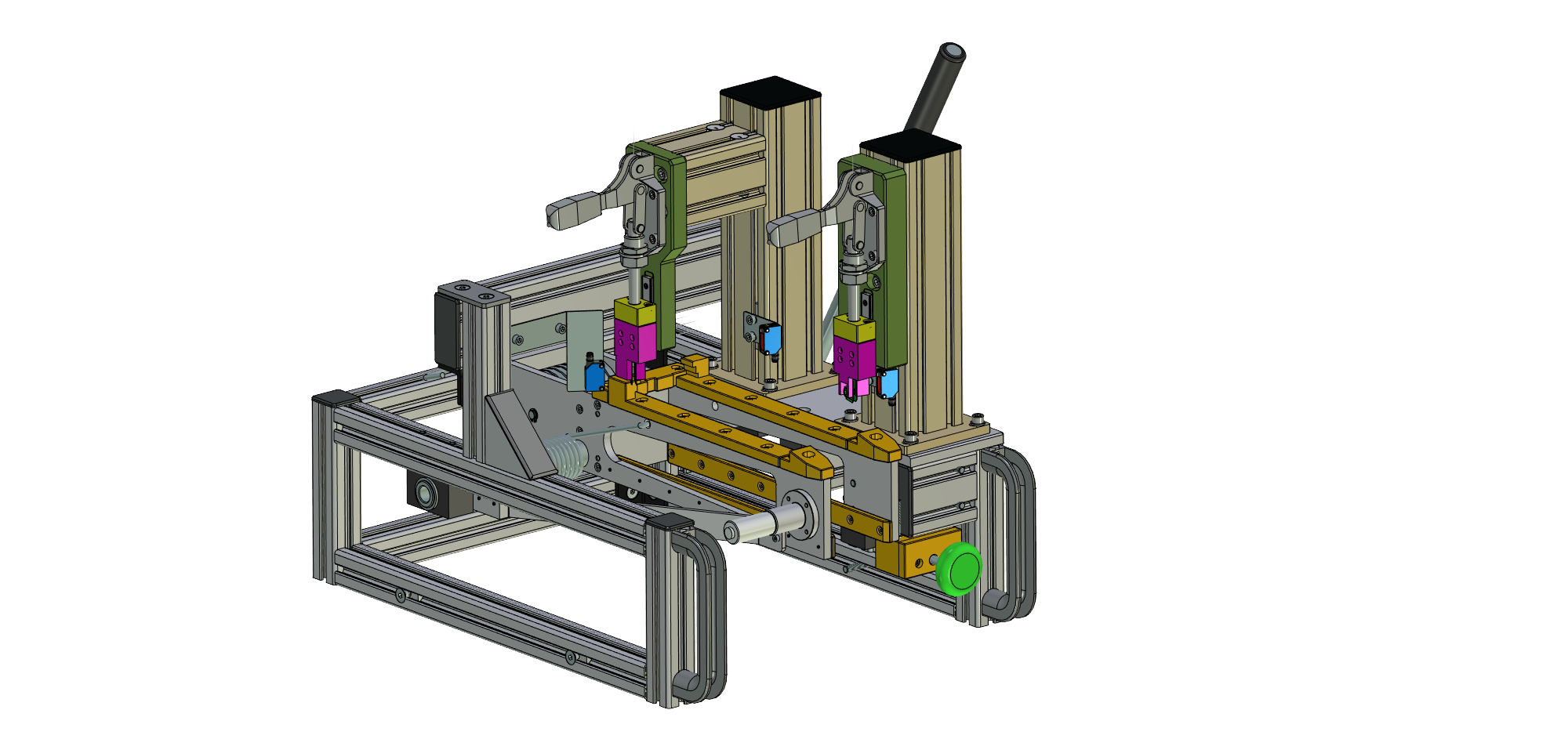 Poloautomatický montážní stůl pro dva kroky montáže. Operátor díly do zařízení pouze zakládá a vyjímá hotové montážní celky.