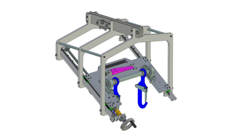 Rotační kleštinový manipulátor pro sundávání velkých dřevěných cívek z přepravní palety. Manipulátor je upevněn na zdviži. Obsluha nejdříve ručně upne kleštinu okolo cívky. Tu pak zdviž zvedne tak, aby bylo možné paletu odstranit. Následně obsluha klikou otočí cívku o 90°, aby ji bylo možno postavit na zem a odvalovat. Nakonec uvolní kleštinu.