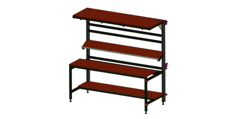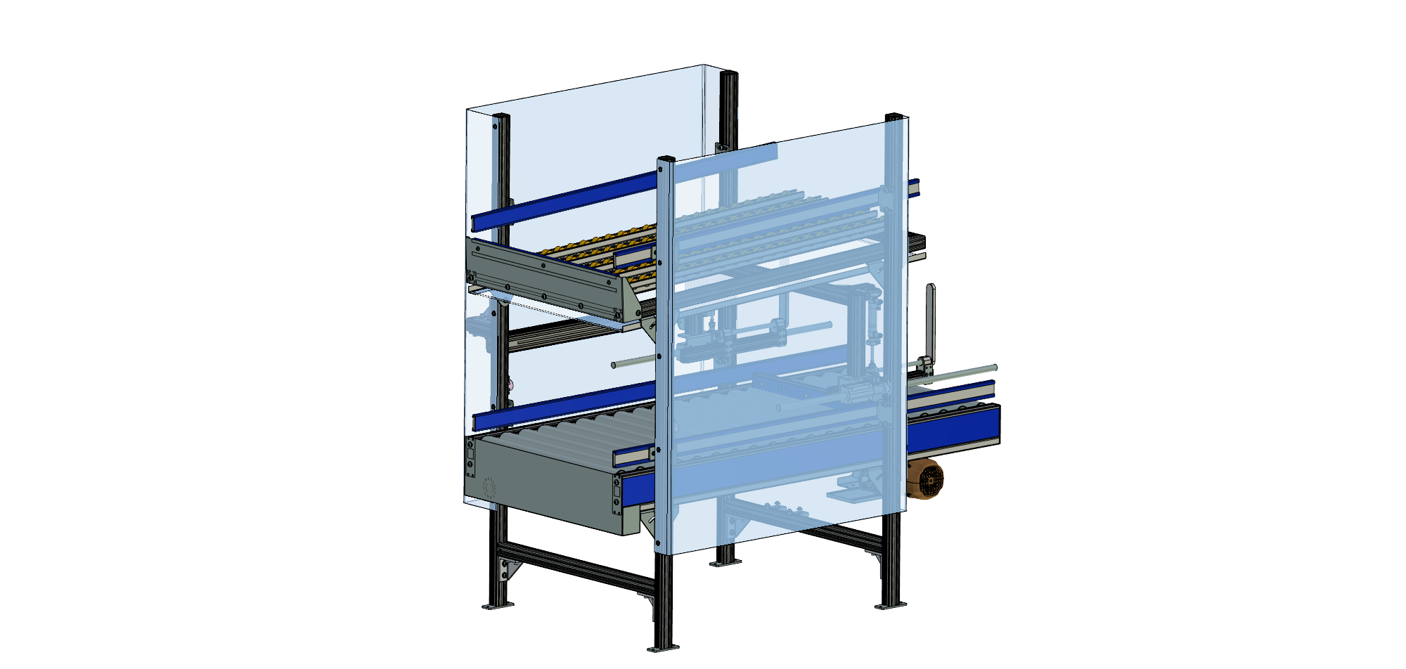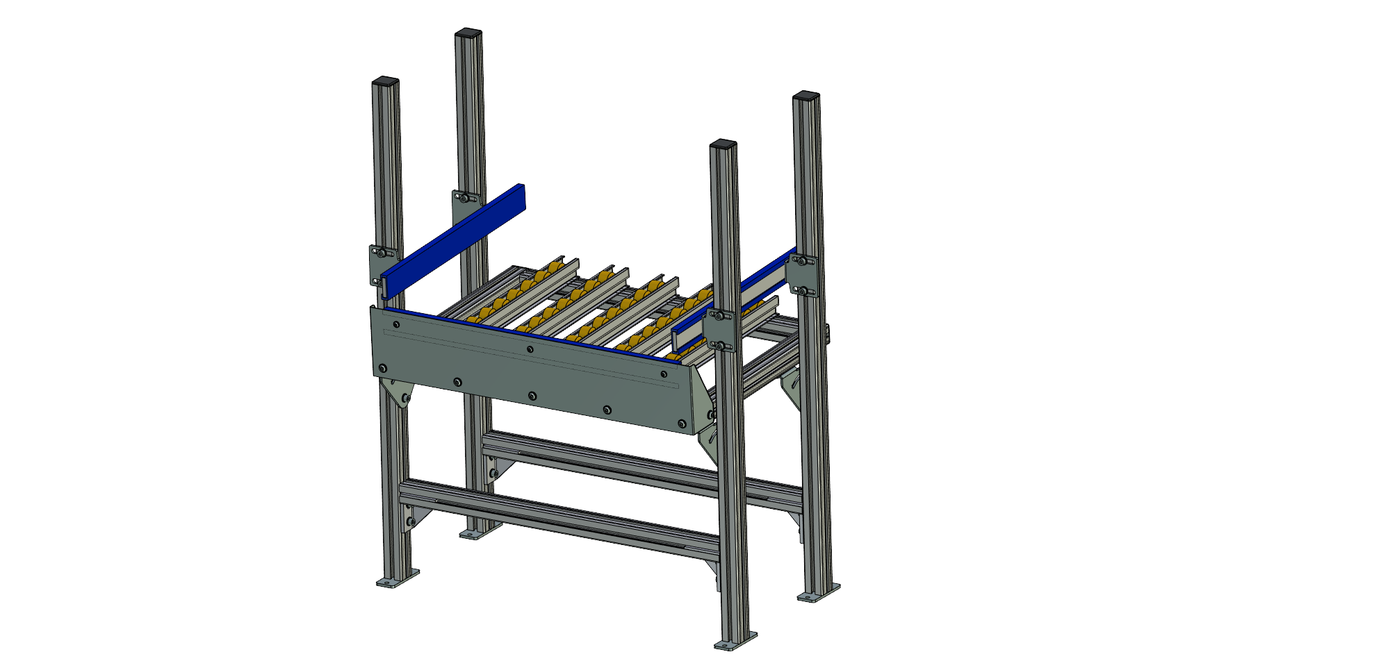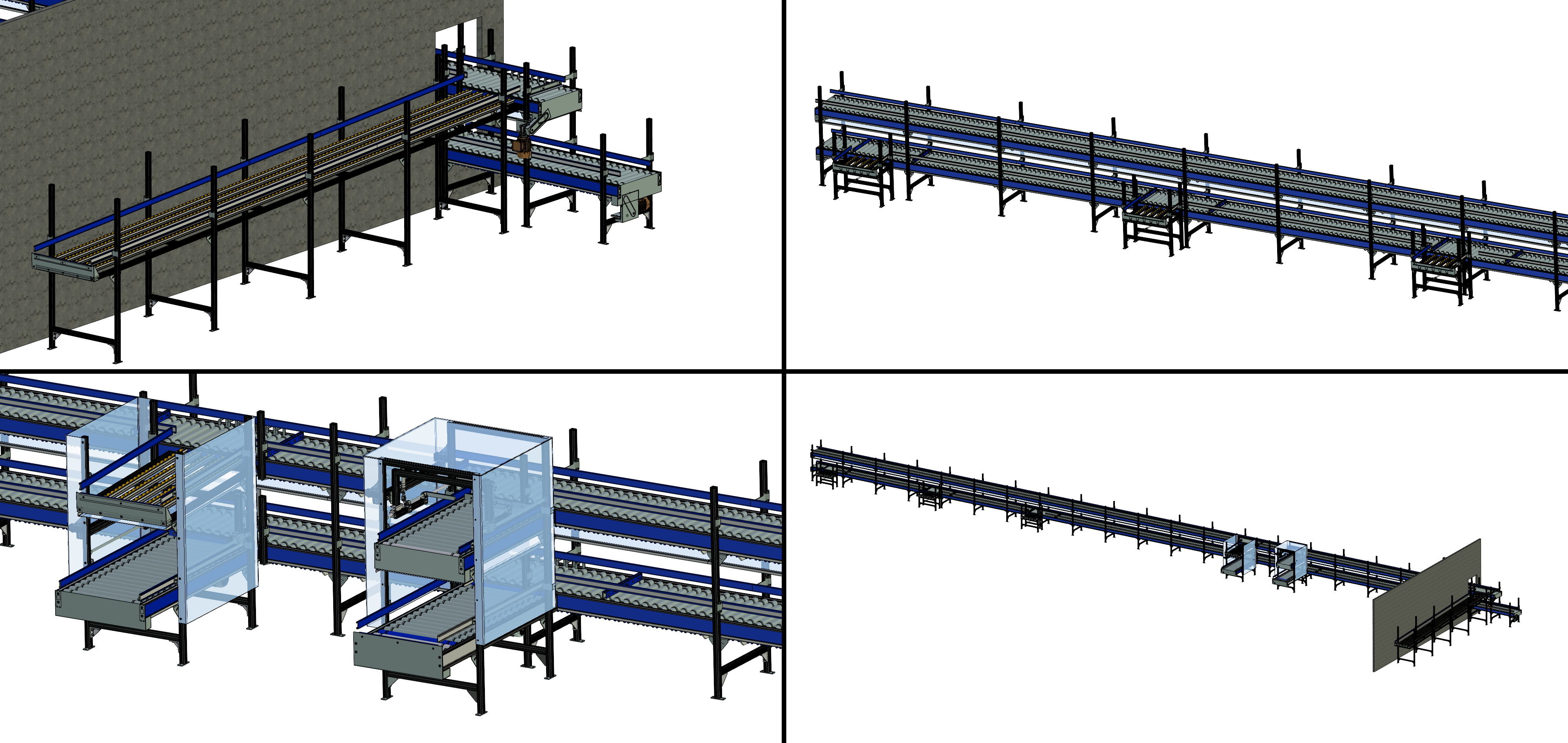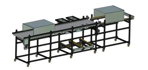 Krátký dvoupatrový kombinovaný dopravník. 1x válečkový a 1x rolnový. Slouží jako zásobník přepravních boxů u pracoviště.