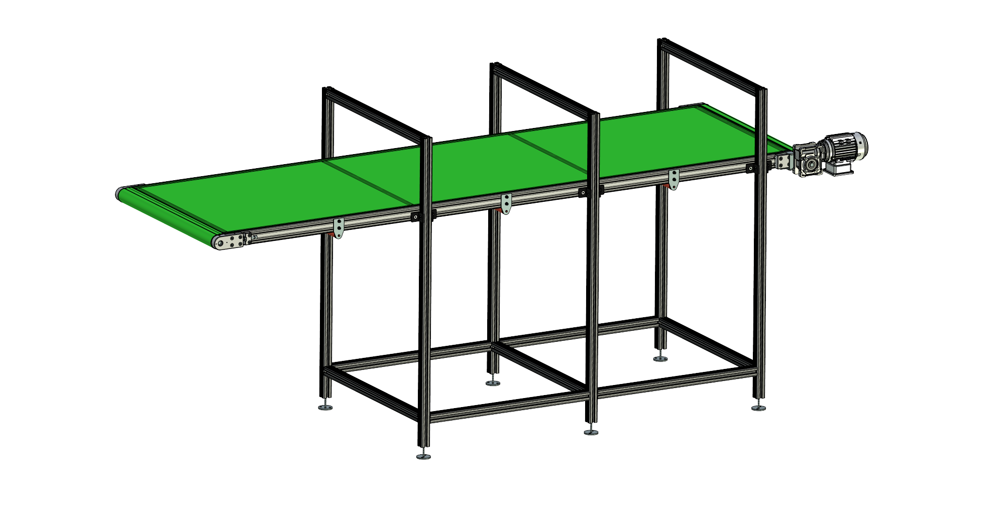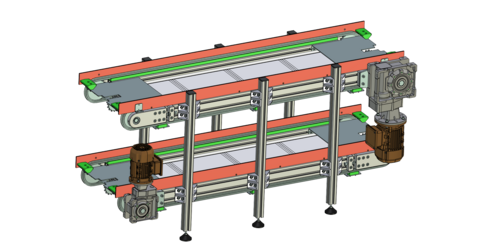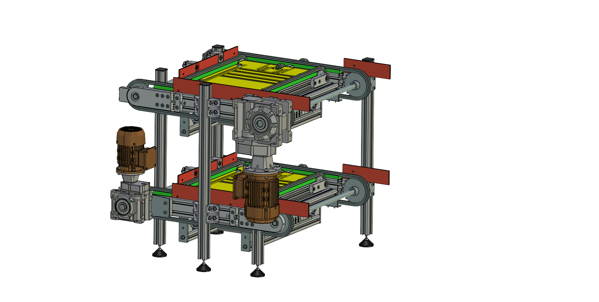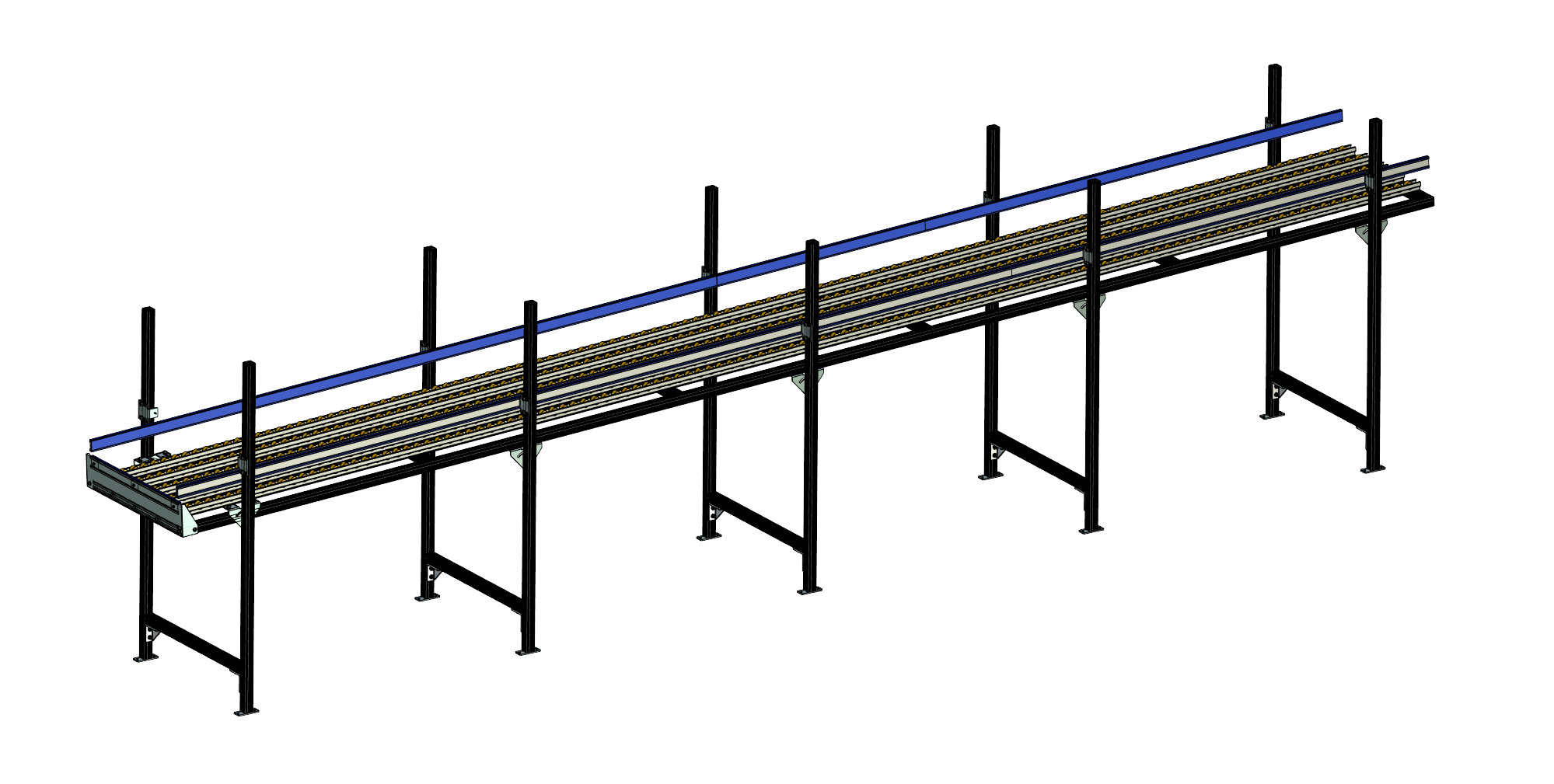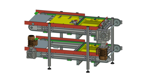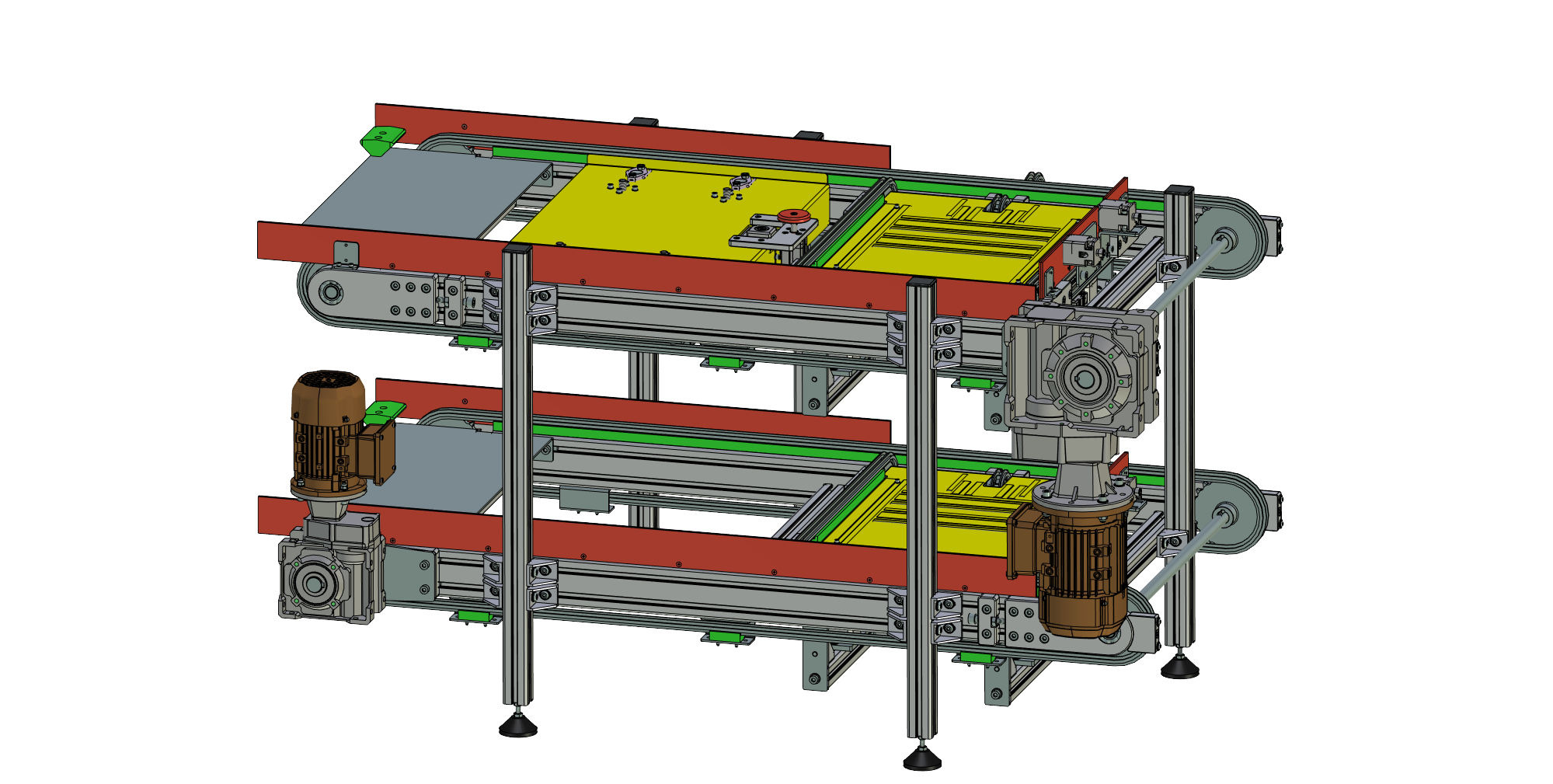Dvoupatrový řetězový dopravník se zastavovací pozicí.