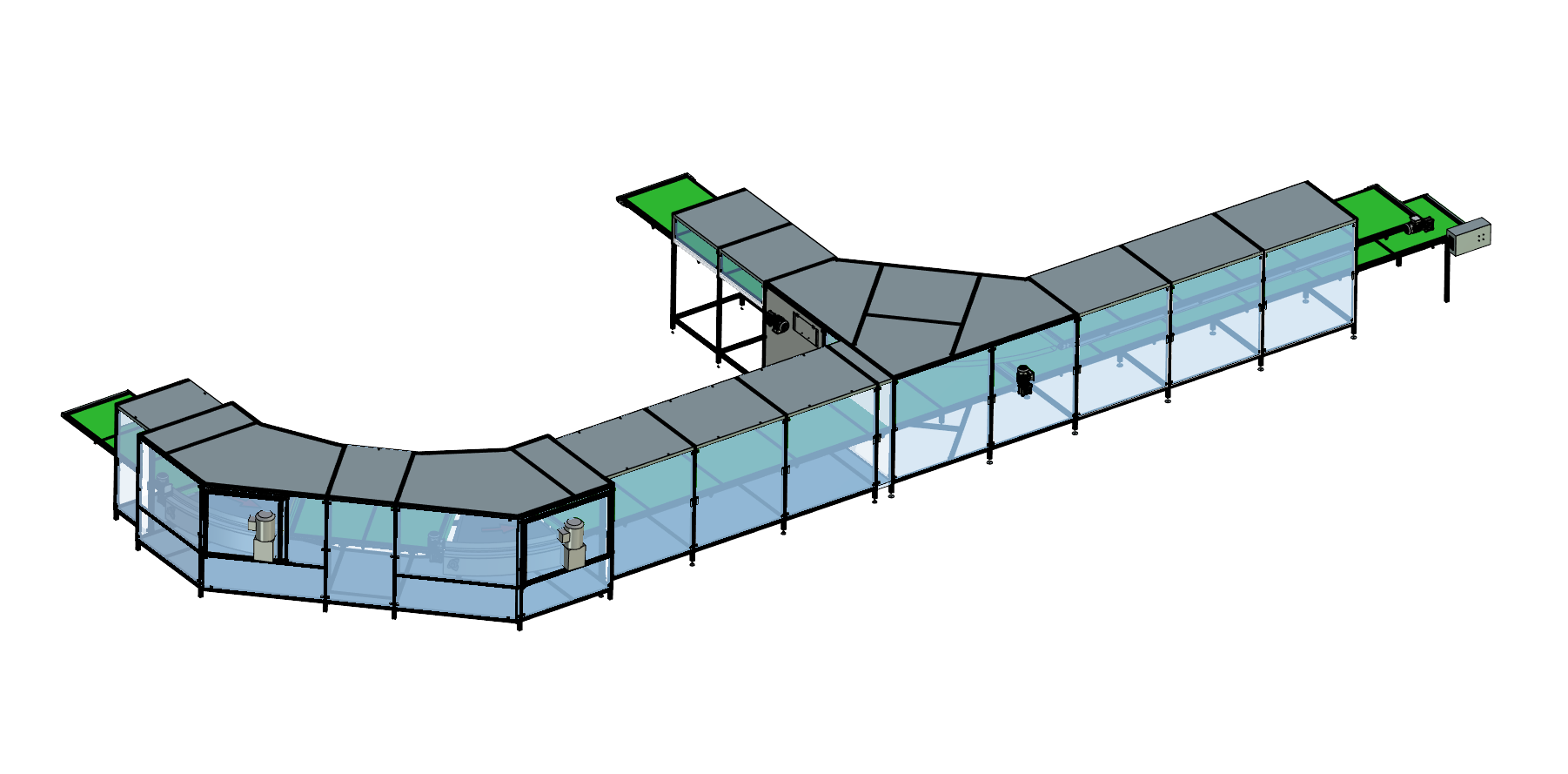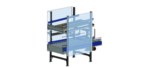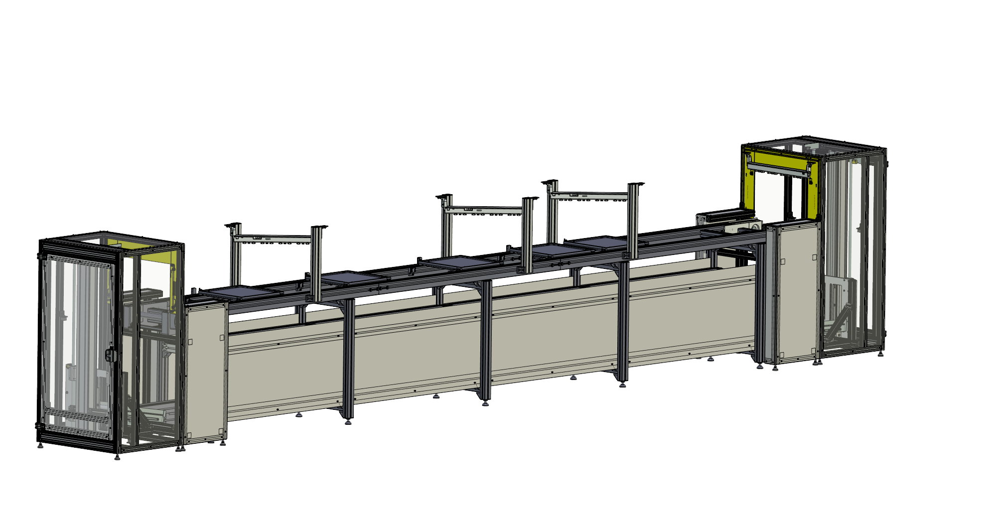 Dvojpodlažní mezioperační paletkový dopravník se dvěma zdvižemi na koncích osazený ionizovaným ofukem stlačeným vzduchem.