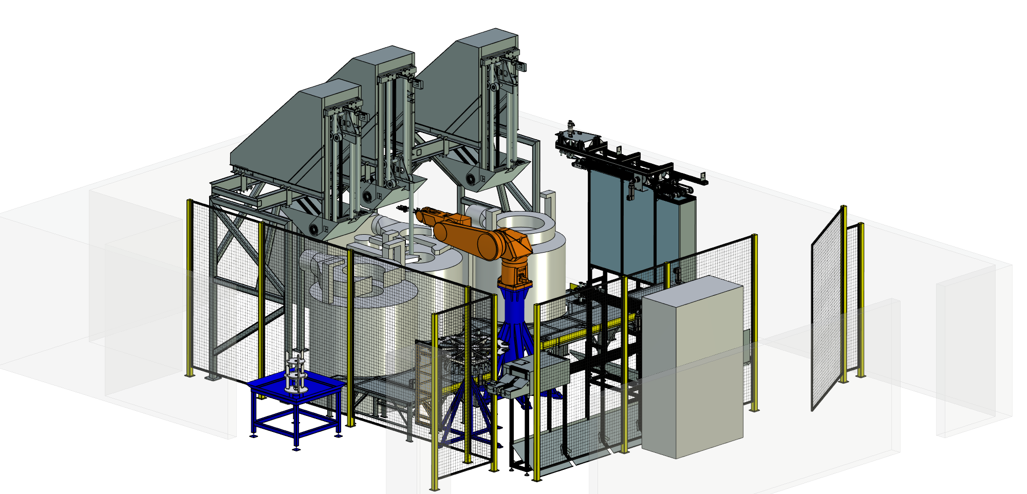 Pracoviště se dvěma jednoúčelovými stroji pro svažování plastových dílů.