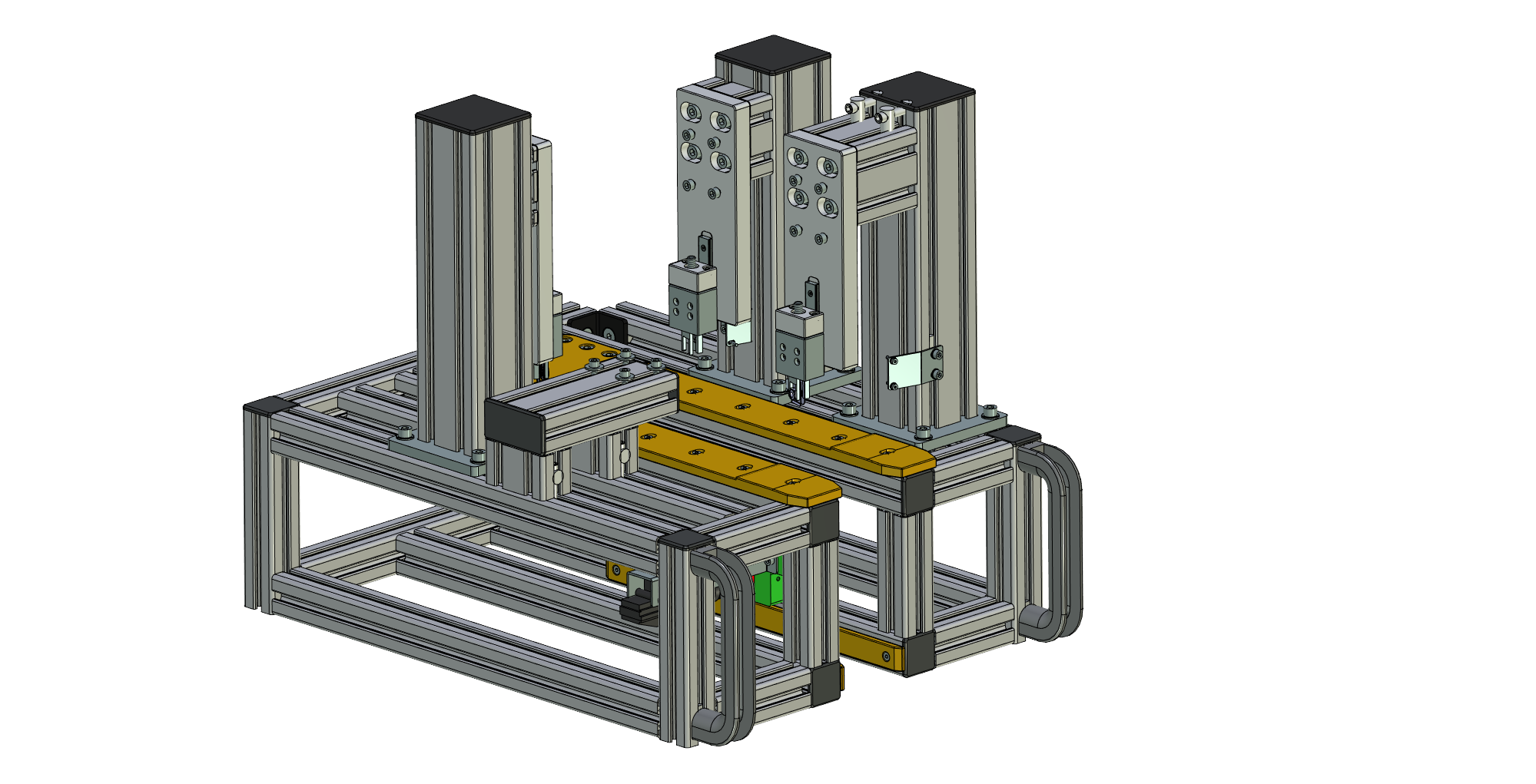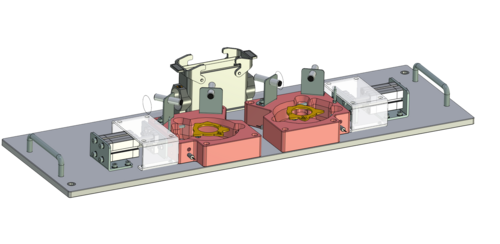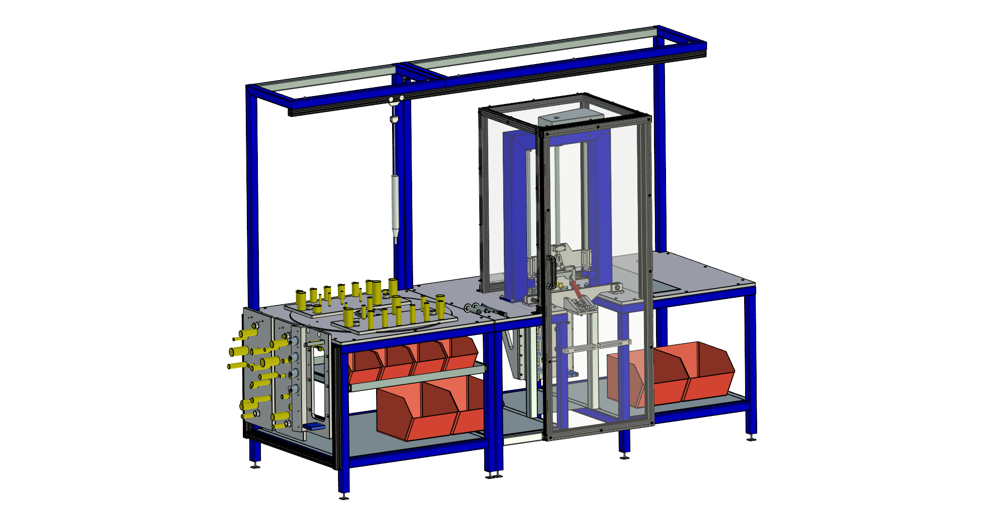 Poloautomatický montážní stůl pro dva kroky montáže. Operátor díly do zařízení pouze zakládá a vyjímá hotové montážní celky.