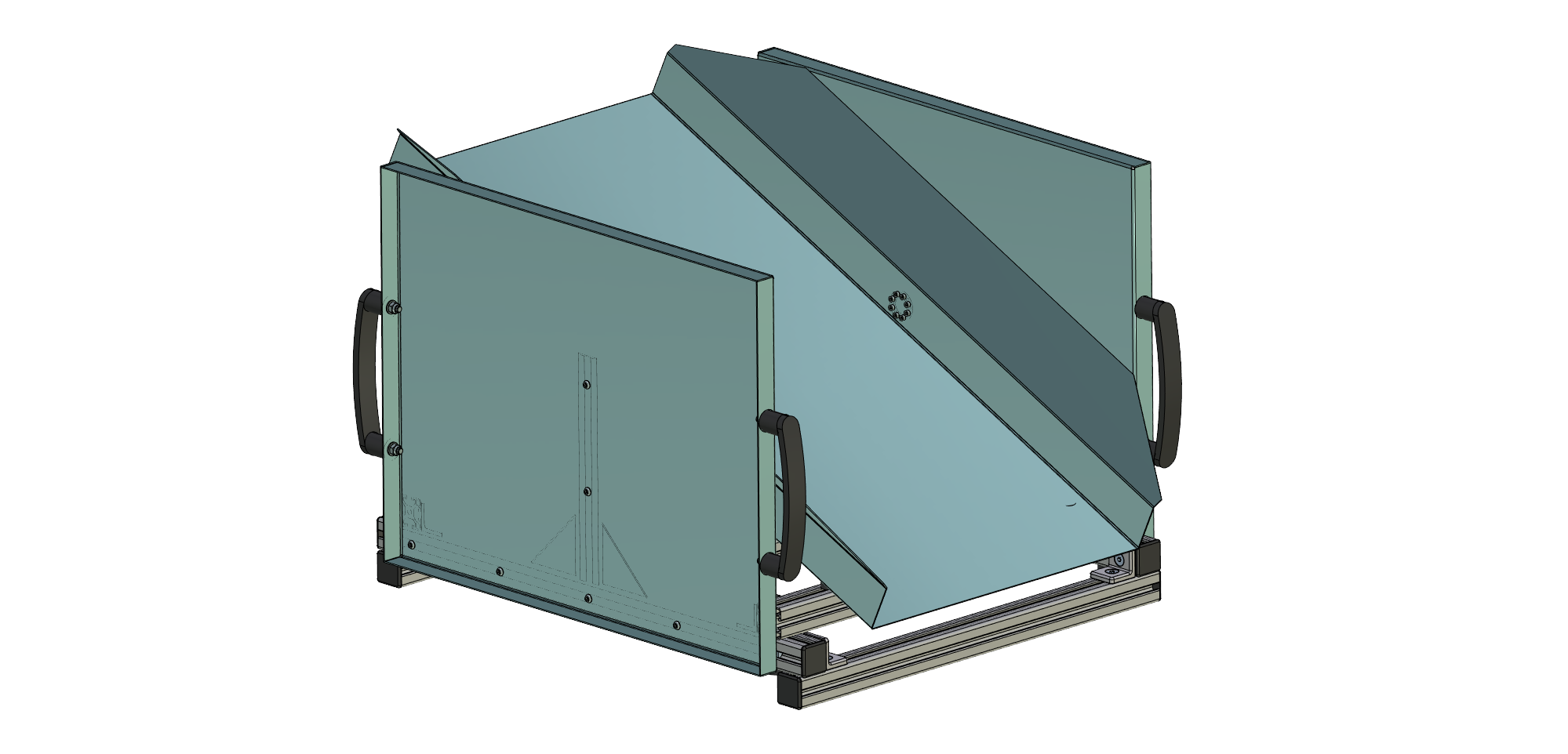 Kolébkový třídič odstřižených vtoků. Podle směru naklopení lze plnit jednu ze dvou beden.