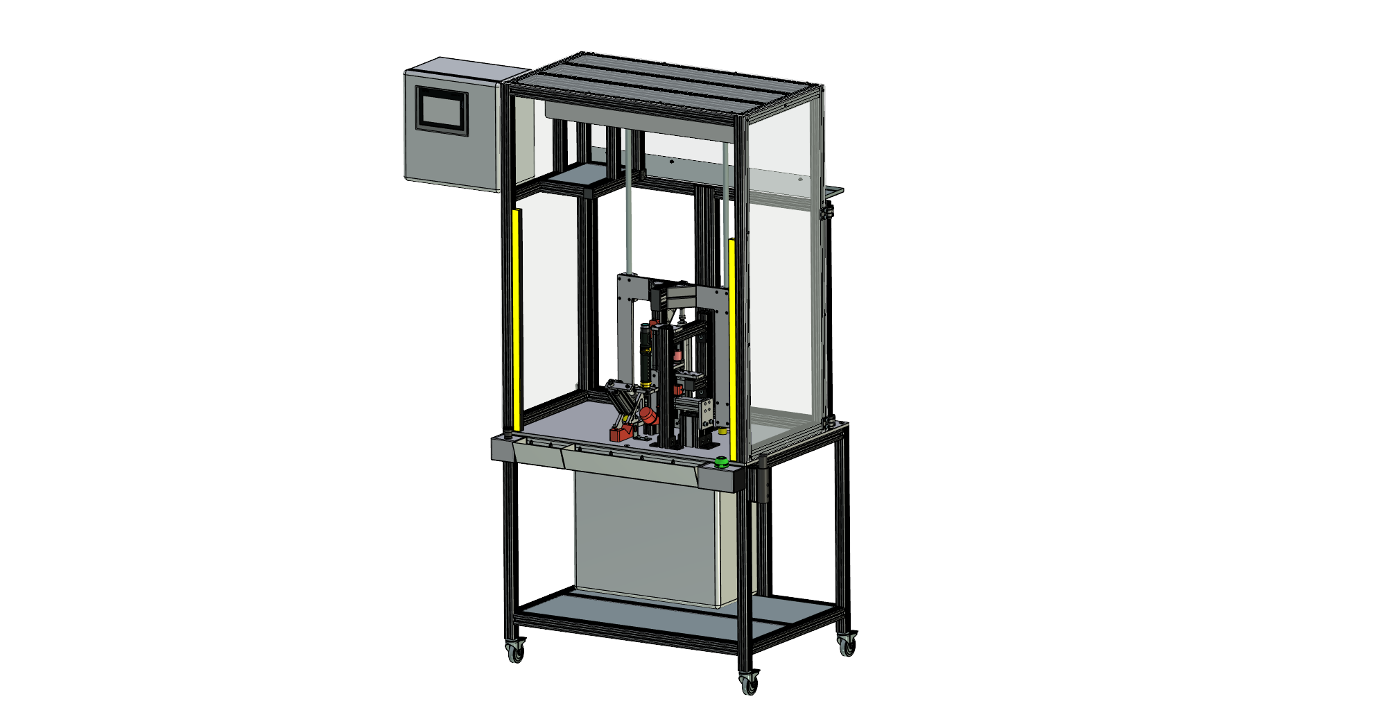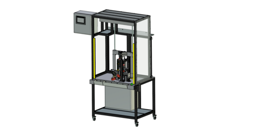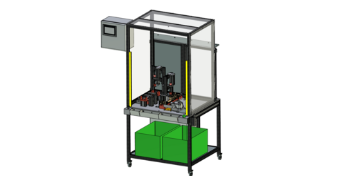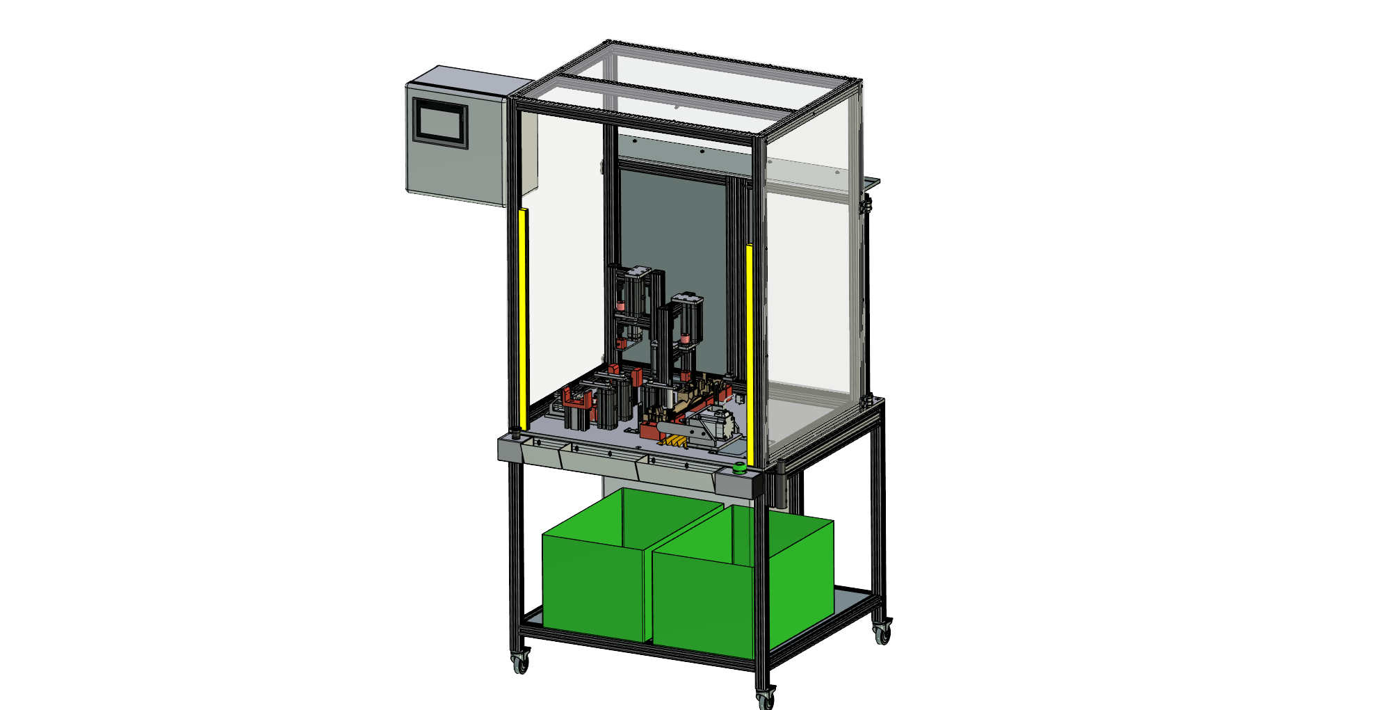 Další jednoúčelový stroj pro zalisovávání kovových prvků do plastového výlisků. Díly jsou vkládány ručně. Automatické zalisování včetně kontroly zalisování. NOK kusy jsou v zařízení zamčeny. OK kusy jsou označkovány.