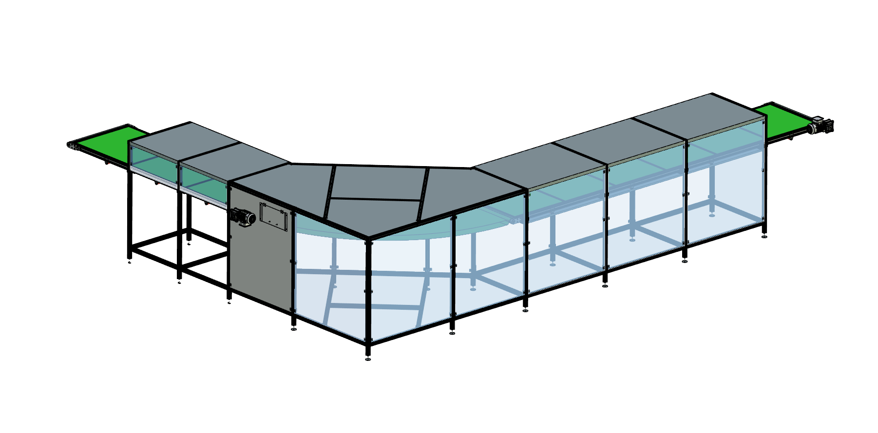 Mezioperační pásový dopravník se zakrytováním proti prachu.
