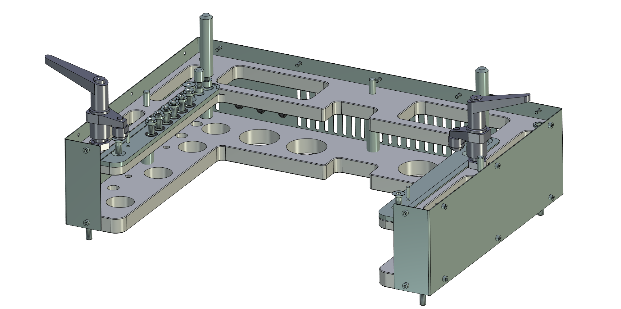 Montážní deska pro víceúčelový rám. Lisování kovových prvků do plastového dílu.