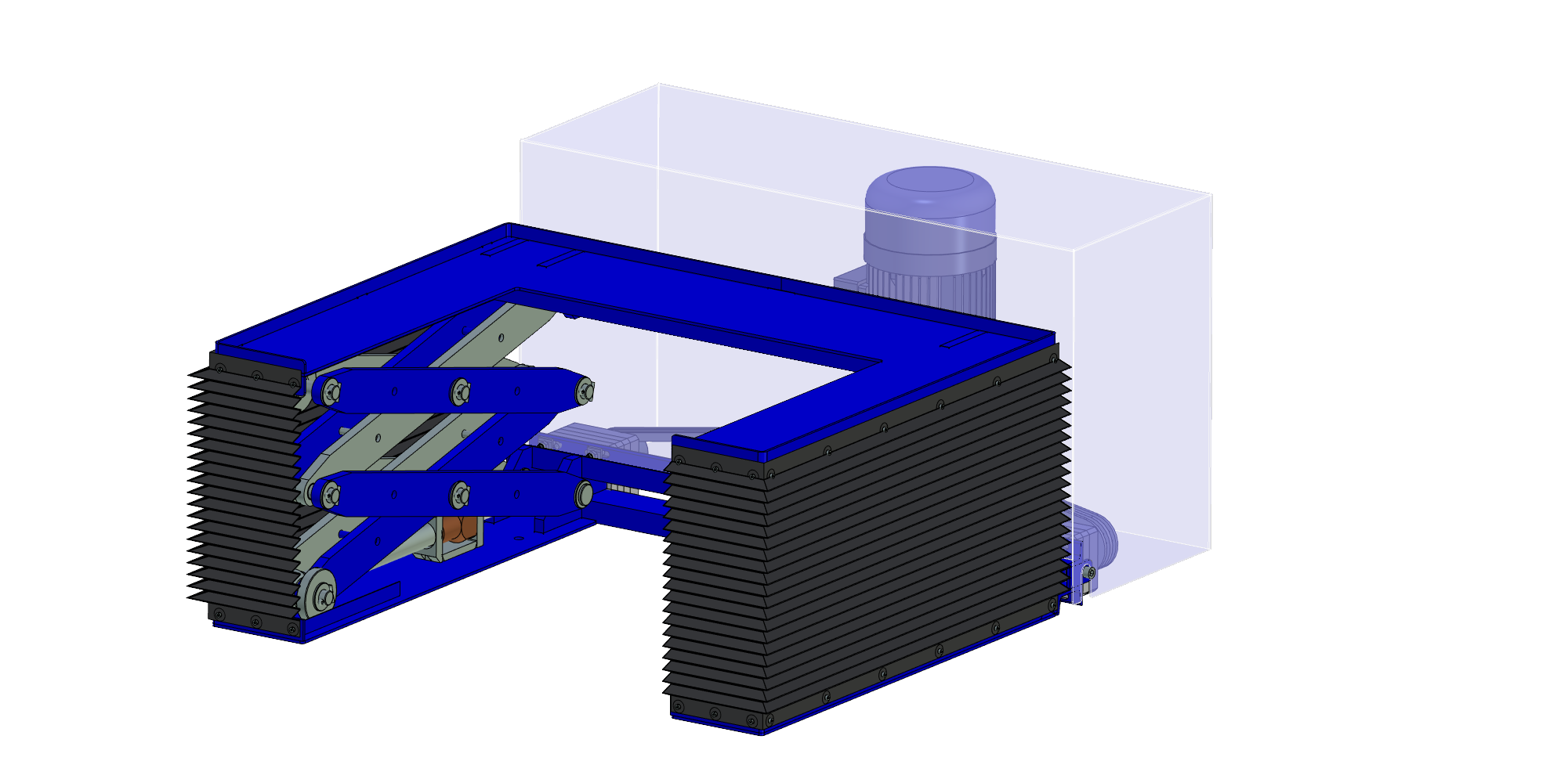 Výškově stavitelná nůžková police. Police umožňuje příjezd paletového vozíku a přizvednutí do ergonomické výšky.
