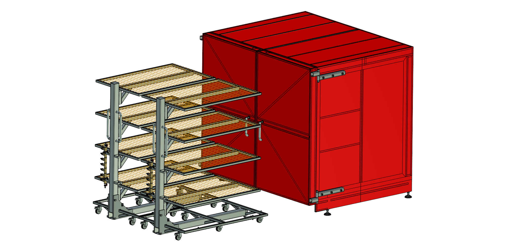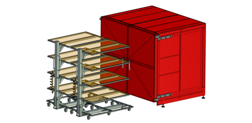 Pec pro zapékání forem s díly z kompozitních materiálů. Zapékání probíhá při nízké teplotě, a formy jsou trvale připojeny na zdroj vakua.