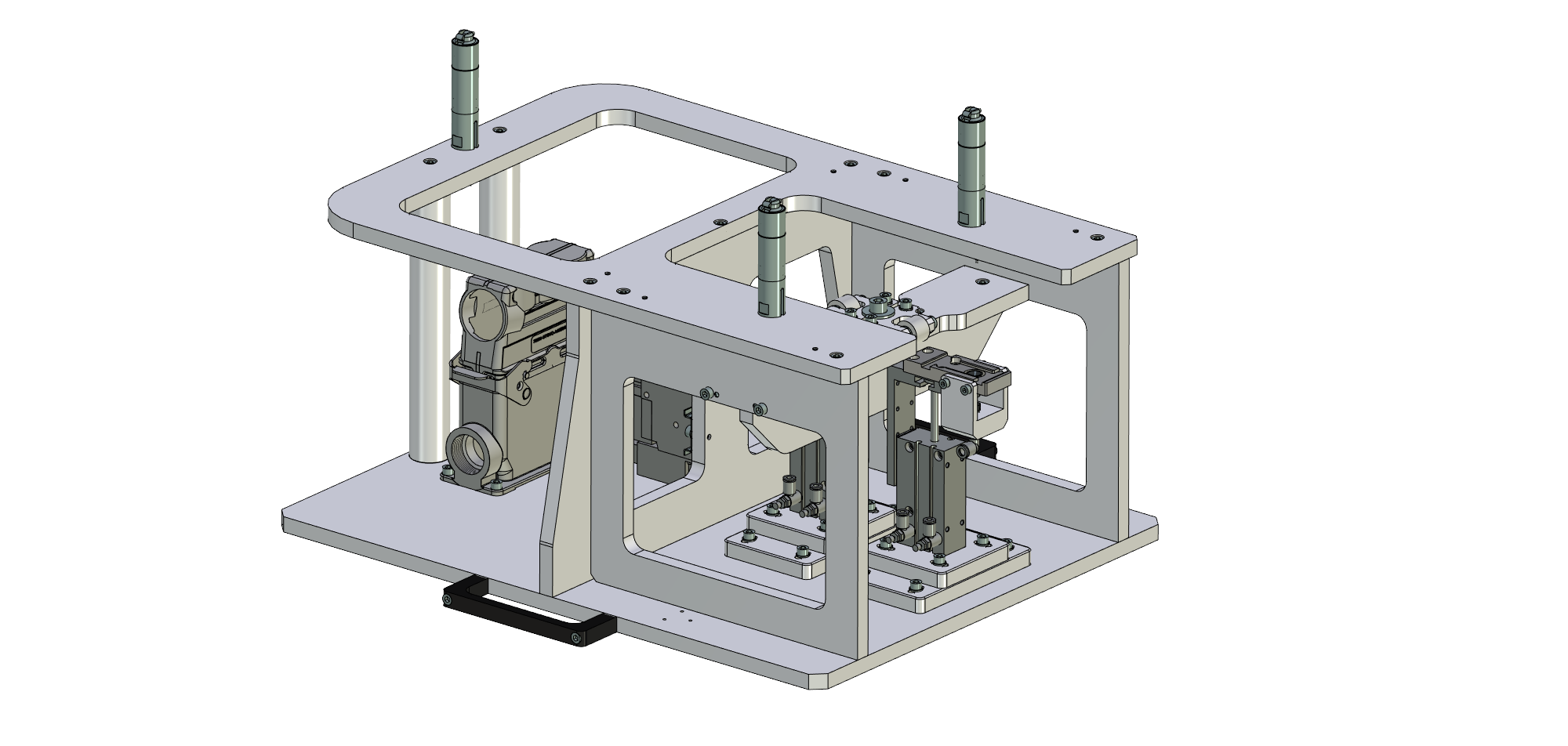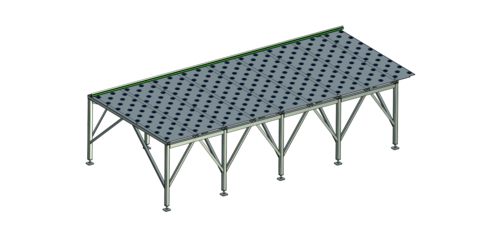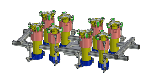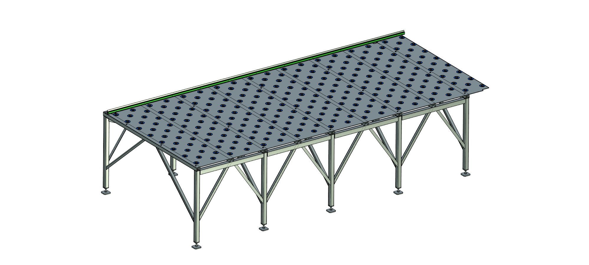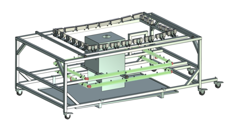 Montážní stůl s trny pro přesné usazení osazované části komory. Stůl je přizpůsoben pro manipulaci na paletovém vozíku a k přizvednutí na nůžkové zdviži.