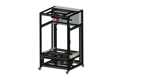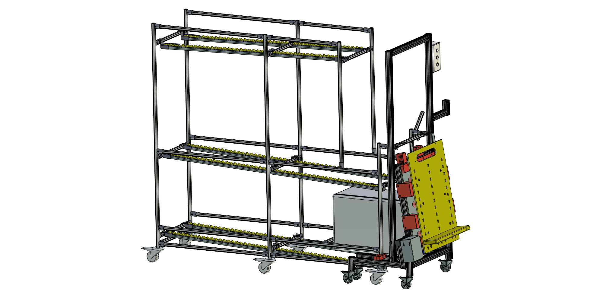 Krátký dvoupatrový válečkový dopravník. Slouží jako zásobník přepravních boxů u pracoviště.