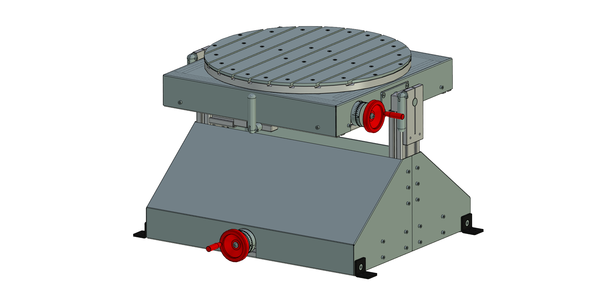 Dvouosé naklápěcí polohovadlo s noniovým odměřováním a zajištěním nastavené polohy. Deska polohovadla umožňuje připojení dalších zařízení přes T-drážky