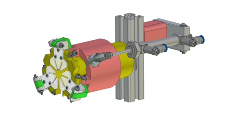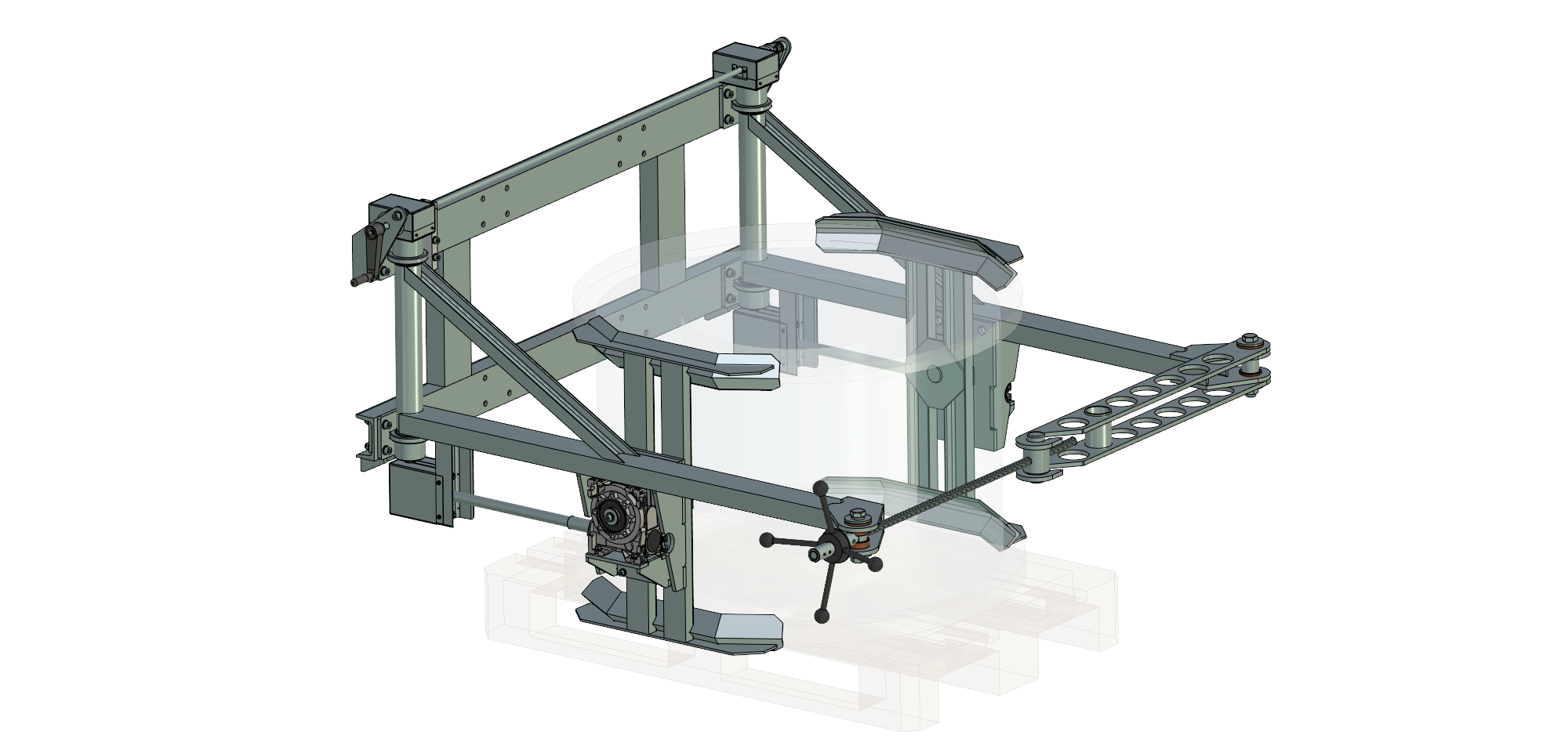 Rotační kleštinový manipulátor pro sundávání velkých dřevěných cívek z přepravní palety. Manipulátor je upevněn na zdviži. Obsluha nejdříve ručně upne kleštinu okolo cívky. Tu pak zdviž zvedne tak, aby bylo možné paletu odstranit. Následně obsluha klikou otočí cívku o 90°, aby ji bylo možno postavit na zem a odvalovat. Nakonec uvolní kleštinu.