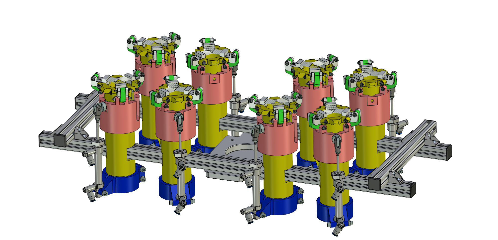Sada efektorů manipulátoru pro odběr ostřižených vtoků z formy po vylisování plastových dílů.