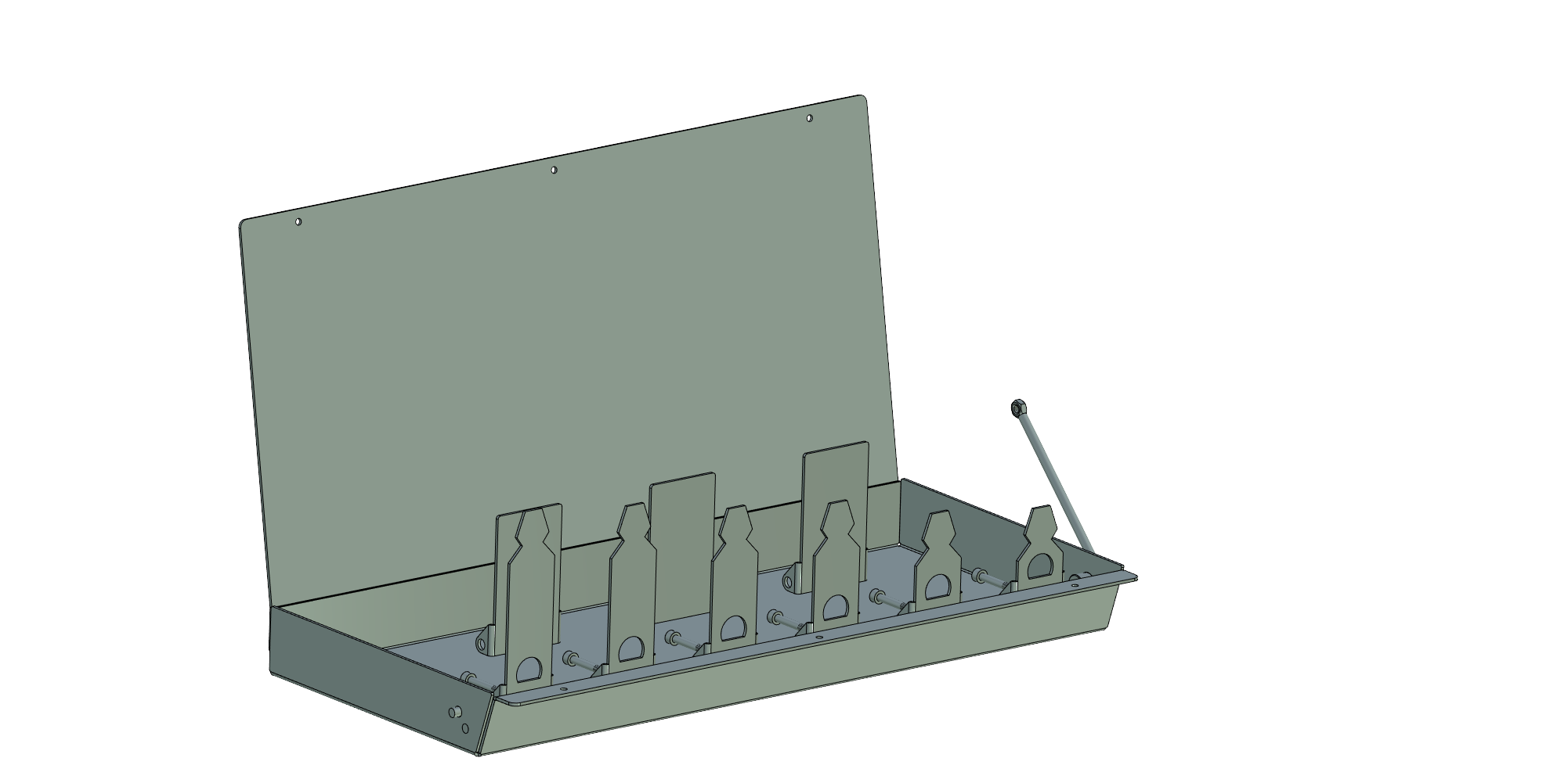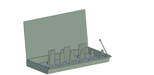 Plechový terč pro trénink střelby ze vzduchovky. Každý z cílů se po zásahu sklopí dozadu. Pákou na boku lze všechny cíle snadno postavit. Terč je v provedení "kufr" pro snadnější transport. Spodní část shromažďuje diabolky.