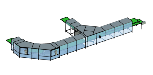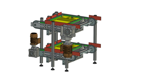 Dvoupatrová mezioperační linka řetězových dopravníků se dvěma zdvižemi a svařovacím boxem. Linka je minimalistická na zástavbový prostor.