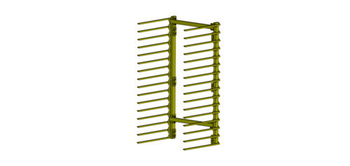 Hřebenová police pro mostový jeřáb. Trny slouží k ukládání palet s výrobky. Hřebenové provedení umožňuje jeřábu překládat palety mezi regály najednou.